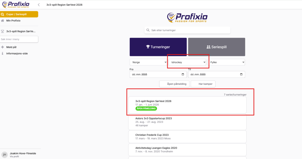 2. Velg ishockey som idrett og trykk på 3v3-spill Region SørVest 2026